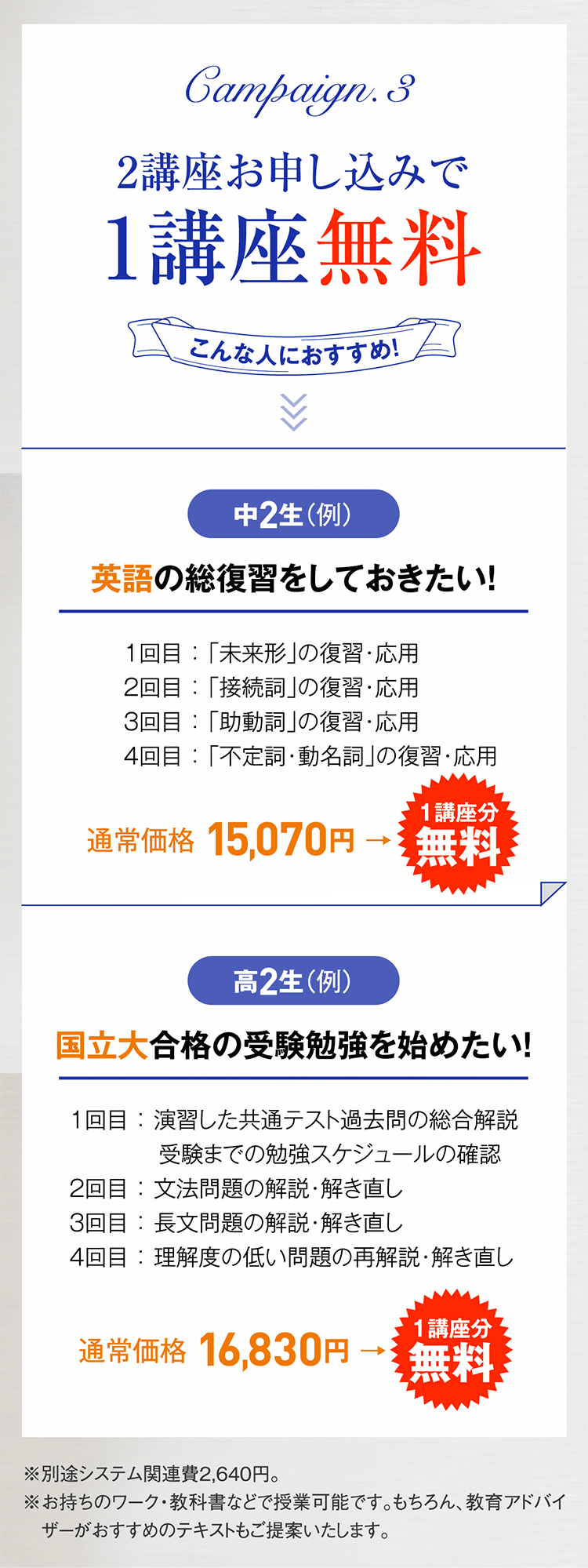 ※1講座無料は、キャンペーン期間中に新規ご入会時、通年授業2講座以上お申し込みされた方に限ります。 1講座のみ適用可能です。(1コマ40分・計160分。)