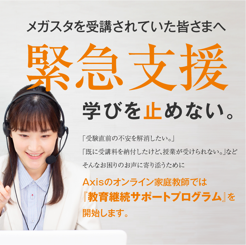 Axisのオンライン家庭教師は、オンライン家庭教師サービス「メガスタ」の運営会社である株式会社バンザン(東京都新宿区)の破産報道を受け、学習継続が困難となった受講生の学習継続をサポートするため、本日より「緊急学習支援」を実施いたします。