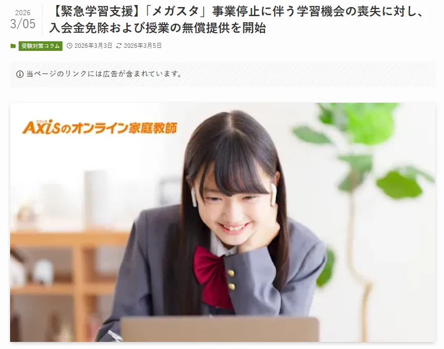 Axisのオンライン家庭教師は、オンライン家庭教師サービス「メガスタ」の運営会社である株式会社バンザンの破産報道を受け、学習継続が困難となった受講生の学習継続をサポートする「緊急学習支援」の内容が「スキルアップエイド」に、掲載されました。